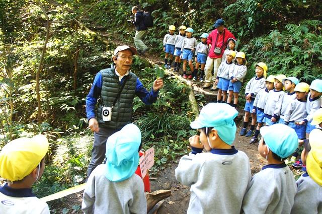 その後、いよいよ森の散策へ出発です。アサギマダラのオスが繁殖のために食べるヒヨドリバナなど、自然の中で昆虫たちと植物が共に生きていること、散策の中で見つけた二ガキやセンブリなどの植物が、薬にもなることについて教えてもらいました。