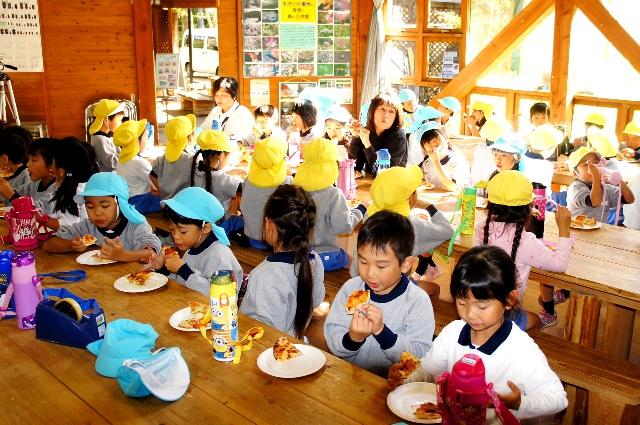 昼食は、森の工作館のスタッフが手作りピザを用意してくれました。石窯で焼いたピザに子どもたちは「いつも、ピーマンを食べないけれど、このピーマンはおいしい!」などと話しながら、美味しくいただきました。