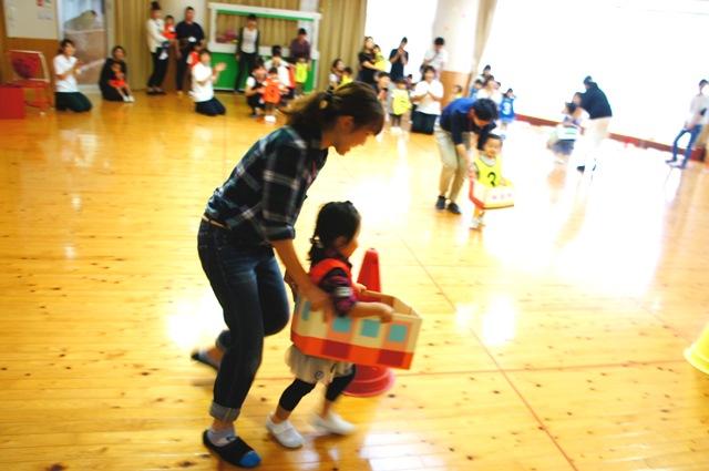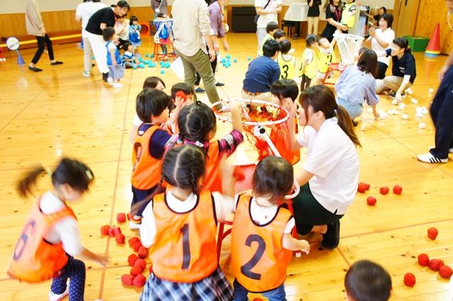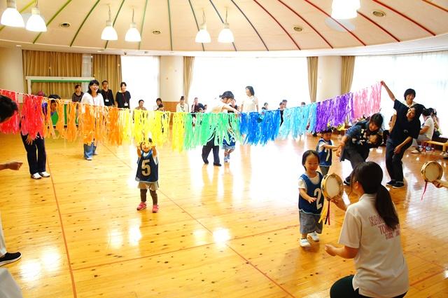 まずは準備体操で、先生のまねっこをしながら「動物体操」をしました。続いて、レインボーに色分けされたゴールに向けて「かけっこ〜ゴールでタッチ!〜」です。次は「玉入れ」、「電車でGo!」と盛り上がり、遊戯室は子どもたちの笑顔でいっぱいになりました。