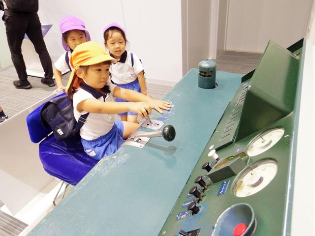 「列車にのろう」のコーナーでは一人ひとり切符を受け取り、自動改札を通る体験をしました。切符は今日の記念のおみやげです。「SLひろば」では、本物の蒸気機関車がありました。車掌さんの合図に、「しゅっぱつ、しんこう!」と声を合わせると、返事をするようにポーッと汽笛を鳴らし、機関車がゆっくり走り始めました。線路の先に現れた梅小路公園はとてもきれいで、時々遠くを本物の電車が走っていくのが見えました。