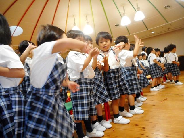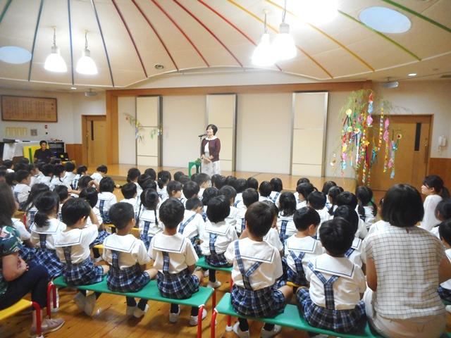 わくわくしながら遊戯室に入ってきた園児たち。朝のご挨拶と楽しい手遊びの後、園長先生から七夕の由来や織姫と彦星、短冊に書いた願い事などについてお話がありました。