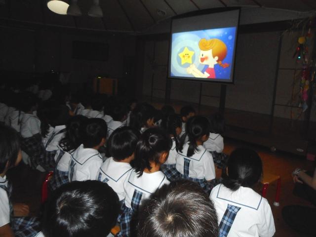 続いて、先生たちによるブラックシアターの始まりです。暗くした遊戯室にお星さまがキラキラと浮かび、園児たちは楽しみながら七夕の物語に聞き入っていました。