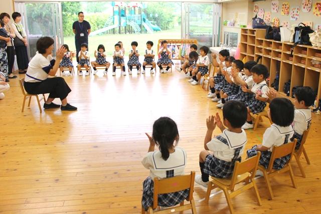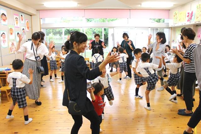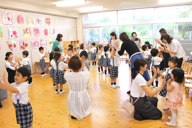 まずは黙想をしてから朝の挨拶です。クラス毎に、手遊び歌や保護者の方々と一緒にダンスをして触れ合いました。子どもたちの園での日頃の様子を直接見ていただき、保護者の方々も喜んでいました。