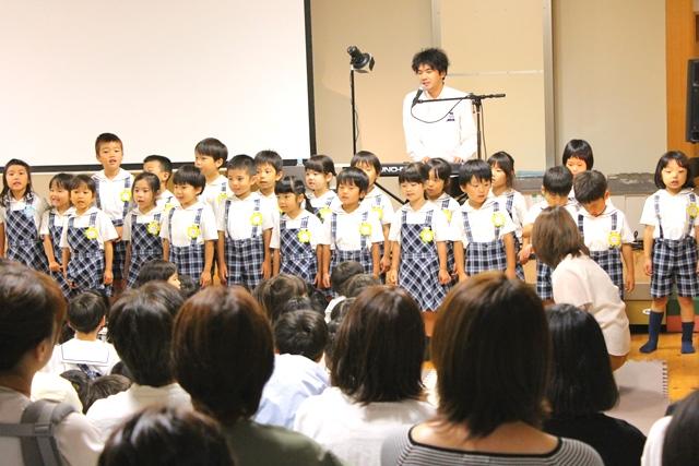 映像や歌の歌詞などをスクリーンに映し出しながら語る素敵なトークと、綺麗な歌声に園児たちも保護者の方も一瞬で魅了されました。前半は「どんぐりころころ」や「ちょうちょう」など子どもたちも知っている曲で、一緒に歌っていました。前半の最後には、年長児が弓削田さんと一緒に『みんなで手をつなごう』を歌い、保護者の方に披露しました。