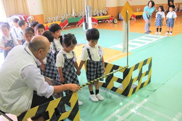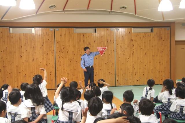 まずは交通指導警察官の方から、犯罪を防ぐためのお約束「いかのおすし1人前」を1つ1つわかりやすく説明していただきました。また、信号の意味や横断歩道の渡り方、踏切での安全確認についても教えていただき、交通ルールをクイズ形式で教えてくれるDVD鑑賞も行いました。