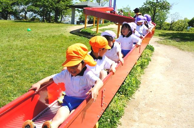 長いローラー滑り台には、順番を待つ列ができています。みんなで一列に連なり、お尻の下のローラーの回転振動に「きゃー、くすぐったい」と笑いながら滑りおりてきました。アスレチック遊具やジャングルジムを使って遊んだり、長い坂のある芝生の広場で、転がるボールを追いかけながらサッカーやフープを楽しみました。