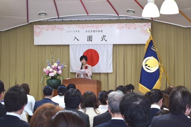 入園式ではまず、一人ひとりの名前を読み上げ、園長より年少組は45名、年中組には1名の新入園児に入園が許可され、奈良学園幼稚園に新しいお友だちを迎えました。