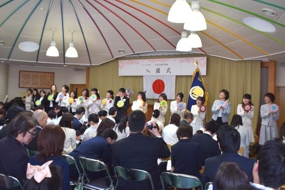 教職員紹介の後、手作りの花を手に春のメドレーを教職員で歌い入園式に花を添えました