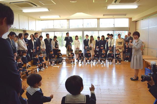 園長は式辞で「朝は『おはようございます』と元気に挨拶する、名前を呼ばれたら『ハイ』と返事をする、やさしくしてもらったときは『ありがとう』と言って笑顔を見せるという3つの約束を守って欲しい」と話しました。改めて「入園おめでとうございます!」と園長先生が言うと、「ありがとうございます」と大きな声で返事ができました。
