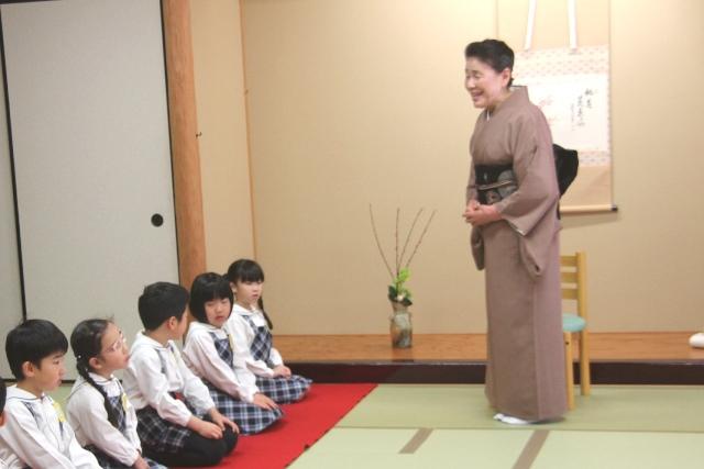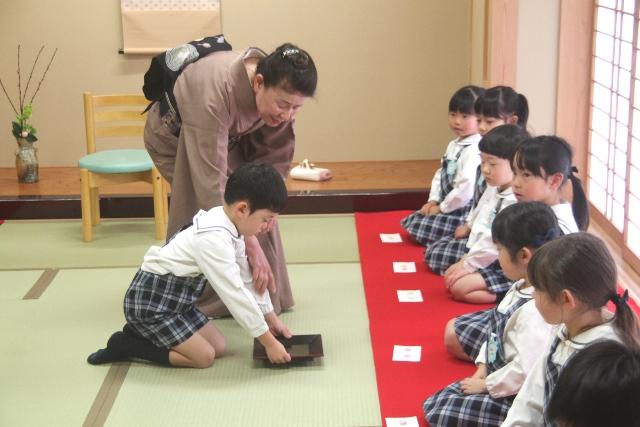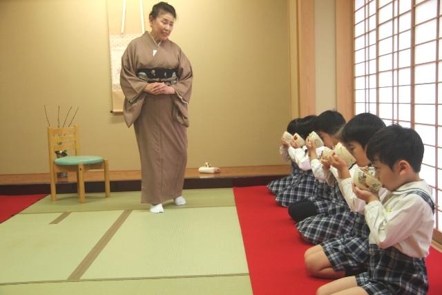 年長児たちは毎月1回、裏千家の赤木宗好先生より礼法を学んできました。今日は、これまでのお稽古の成果を保護者の方々に見ていただきます。