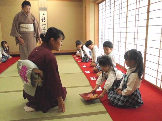 まず、入室の作法から。子どもたちは、指をそろえて丁寧におじぎをする「真」のおじぎをした後、ゆっくり立ち上がり入室します。全員が入室すると先生は、床の間に飾られていた蝋梅の花について分かりやすく説明されました。そして、この日のテーマである正しいお菓子のいただき方です。お盆を前にした園児たちは、「お先に頂戴いたします」と一礼をし、懐紙に一つずつ菓子をとる稽古をしました。