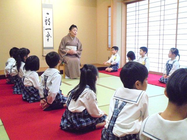 1月21日(月)、作法室で年長組の園児が、裏千家の赤木宗好先生から礼法を教わりました。