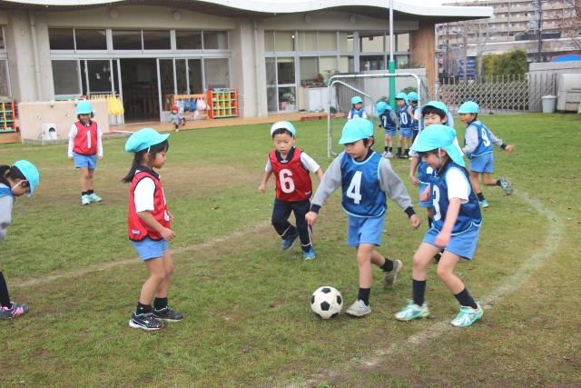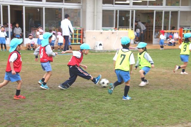 ボールがコントロールできるようになってくると、グループごとにゼッケンをつけて、ゴールを使ってミニゲームをします。赤・青・黄の3グループが交替で対戦し、シュートを決める子やゴールを守る子、サポートする子など、子どもたちが絶妙なコンビネーションでプレーができるようになっていました。