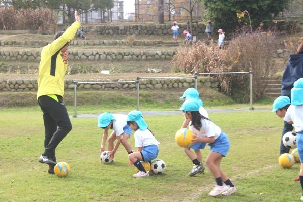 準備体操の後、ボールに触れるタッチボールの練習からスタートです。ボールに片足を交互に乗せるタッチボールの後は、足の内側を使ってボールを左右に動かすインサイドドリブルの練習もしました。続いて、足の外側を使ったアウトサイドのドリブル練習にも挑戦し、先生から「よくできました」とグリーンカードを出してもらいました。