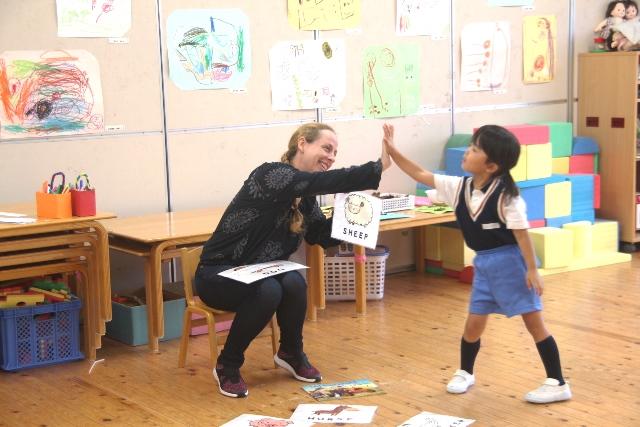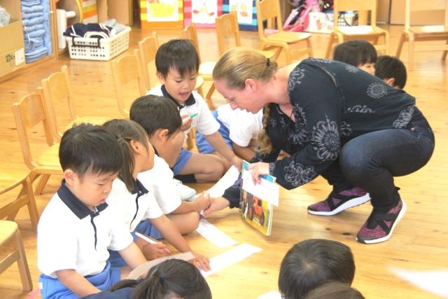 デビ先生は、絵本やカードを使いながら英語での鳴きまねをしました。豚は「oink(オインク)」、ヒツジは「baa(バー)」など、日本語と英語で違う鳴き声に興味津々の園児たち。「ゆかいな牧場」を歌いながら、鳴き声と動物の名前も覚えました。歌の後は、「イーアイイーアイオー(EIEIO)」のアルファベットの練習です。先生のお手本を見ながら紙に書き込み、まねをしながら英語を親しみました。