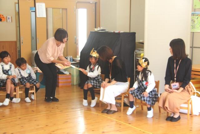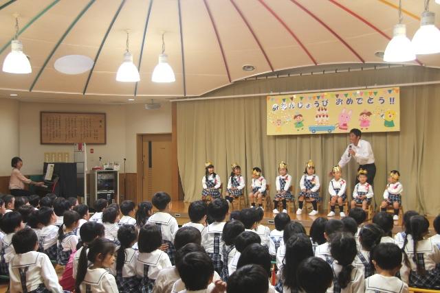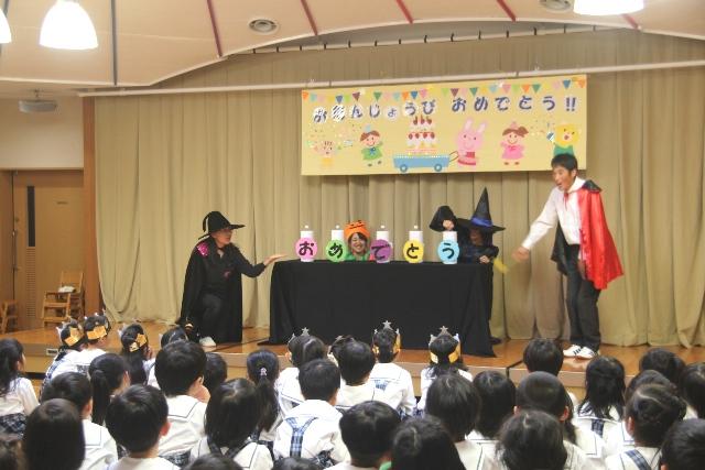 10月26日(金)、遊戯室にて10月生まれの園児たちのお誕生会を行いました。当日は、お誕生日を迎える園児たちの保護者の方々にもご参加いただきました。