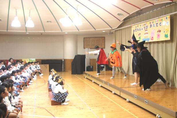 10月末にあるハロウィンにちなんで、魔法使いやかぼちゃの仮装をした先生たちが、楽しいダンスや色が変わるペットボトルのおばけのマジックなど、ハロウィンショーを開催すると、子どもたちは歓声を上げて見入っていました。