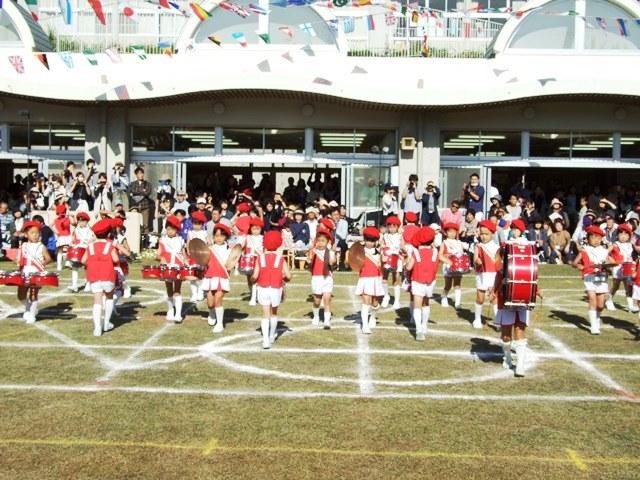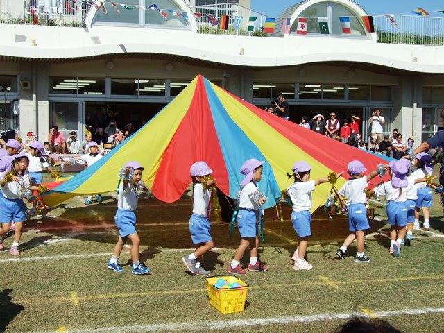見どころの一つは「奈良学園Pre-Primaryマーチングバンド」です。年長組のマーチングバンドが入場してきました。続いて、年中組がフラッグとリング、年少組がポンポンで参加し、4曲を見事に演じきり、保護者席から盛大な拍手が起こりました。
