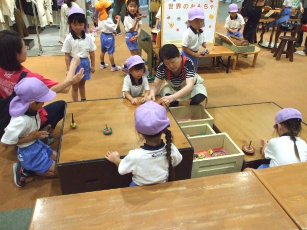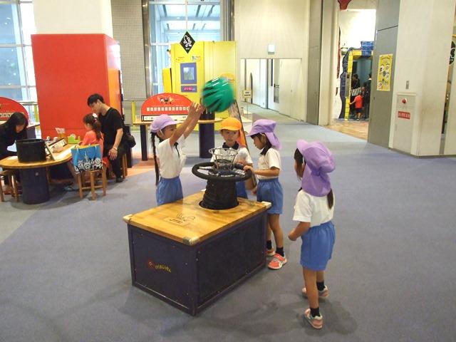 5階の「やってみる階」からまわった年中組と年長組は、『科学』のエリアにある「人が入れるしゃぼん玉」を作ったり、「エアシュート」でボールを空中に浮かべたりしました。また、実物の電車に乗ったりもでき、子どもたちは歓声をあげながらいろいろな展示やワークショップを体験しました。4階と5階に広がる『こどもの街』では、ぐるぐる迷路や滑り台などのアトラクションで体を動かして楽しみました。