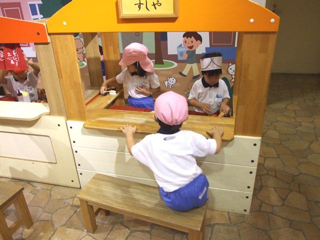 館内に入場すると、学年毎に分かれて行動しました。年少組はまず4階の「あそぼう階」に向かいました。お買い物のコーナーでは、かごを持ってお買い物体験です。どれにしようか迷うお友だちがたくさんいました。また、「キッズストリート」では、ヘルメットをかぶってパイプを修理したり、ゆうびん局でお手紙を出したり、思い思いに仕事を体験しました。