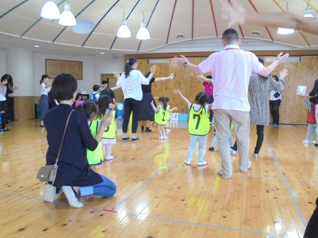 保育室で自由遊びを楽しんだ後、青や黄、赤色のゼッケンをつけて遊戯室に集合しました。園長先生の挨拶の後、音楽に合わせて「動物体操」です。体育の先生がお手本にあわせて、うさぎやゴリラに変身します。手を上げて、ジャンプして、体をかがめて、みんなでポーズをきめました。