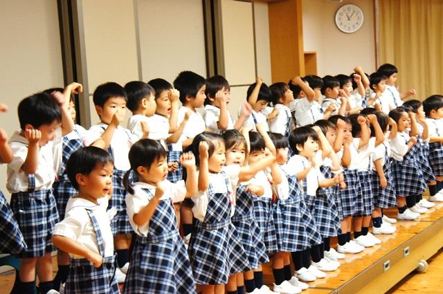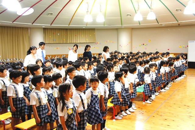 みんなで園歌を斉唱した後、谷川園長は「4月にみんなでお約束をしたことを覚えていますか?朝は元気におはよう!とあいさつをしましょう。名前を呼ばれたらハイ!と応えましょう。誰かに何かをしてもらったら、ありがとう!と必ず言いましょう。お家でも守ってね。そしてみんなができることで、お母さんのお手伝いをしましょう。お家の人に心配させないようにね。夏休みが終わったら、みんな必ず元気で登園してね」と話ました。