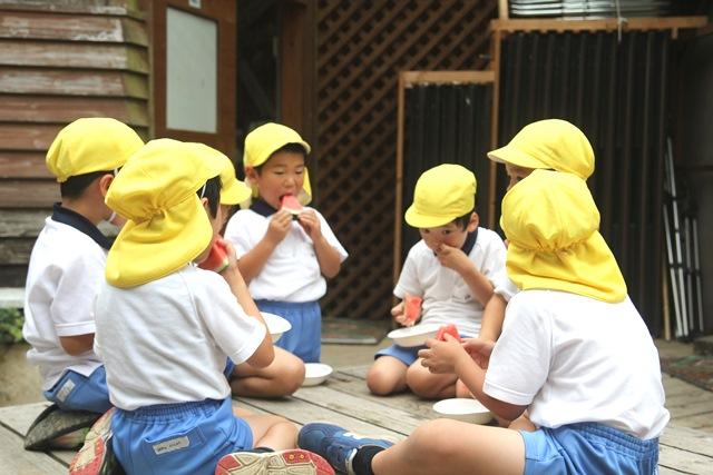 その後自然の材料で作ったネズミの工作をし、スイカ割りをし森の工作館を後にしました