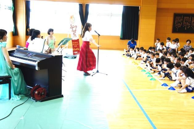全園児と小学校P1・P2(1年・2年)生の児童が、奈良フィルハーモニー管弦楽団のソプラノ歌手とバイオリン、チェロ、フルート、ピアノ奏者の5名による演奏を楽しみました。
