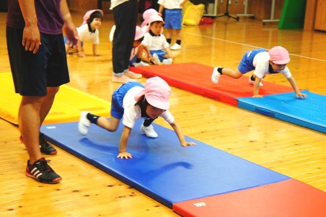 最初は、「ハイハイ」でマットの上を進む運動です。続いて四つん這いの姿勢で手足を伸ばして進む「くまさん」。次は「ウサギさん」で、マットの上をぴょんぴょん進みます。最後はでんぐり返して、かっこよくポーズ。子どもたちは、短時間でマットに慣れ上達していきました。