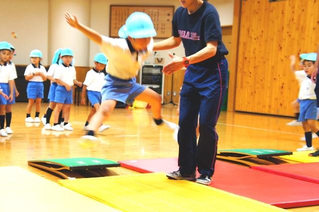 いよいよ跳び箱で二段をリズムに合わせて跳ぶ練習です。子どもたちは、手を付く場所などを確認しながら、回を重ねるごとに、上手に跳び越えることができるようになりました。