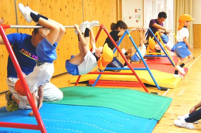 まずは鉄棒の基本から。棒をしっかり握ってぶら下がることから始めました。