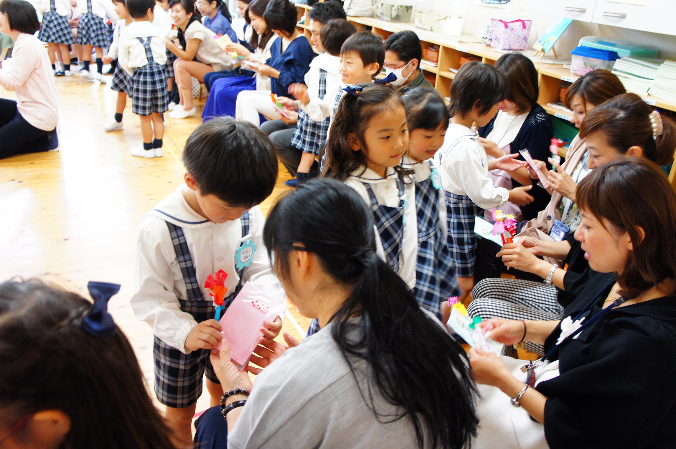 子どもたちが、保護者の方々に心を込めて描いた絵が入ったメモホルダーやキーホルダーを「いつもありがとう」と感謝の言葉とともに手渡しました。