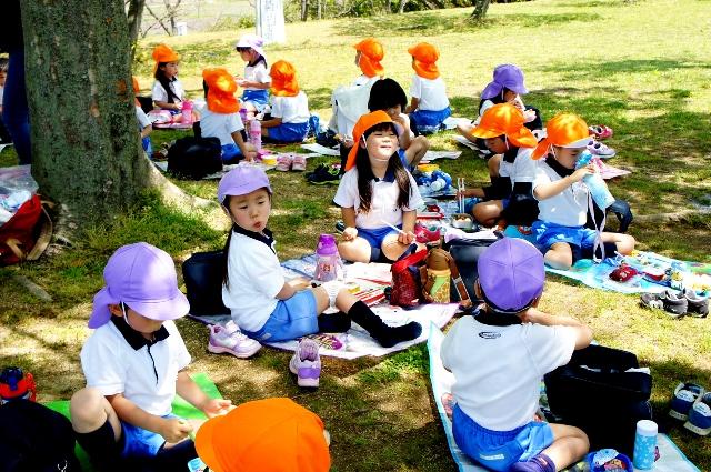 芝生の上にレジャーシートを敷き、「いただきます!」の元気にごあいさつ。愛情がいっぱいつまったお弁当をお友だちと見せ合いながら、楽しく食事をしました。
