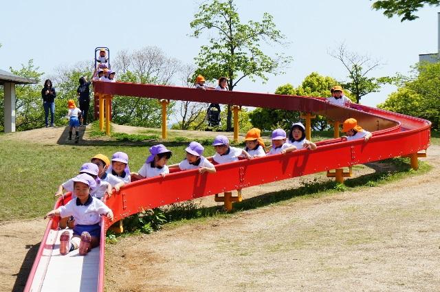 公園に到着すると、さっそく長い滑り台を順番に滑り始めました。お尻の下で回るローラーに「くすぐったい!」「ブルブルする」と盛り上がり、列車のように連なって滑り降りていました。また、ジャングルジムやさまざまなアスレチック遊具に、何度もチャレンジするなど思い思いに楽しみました。