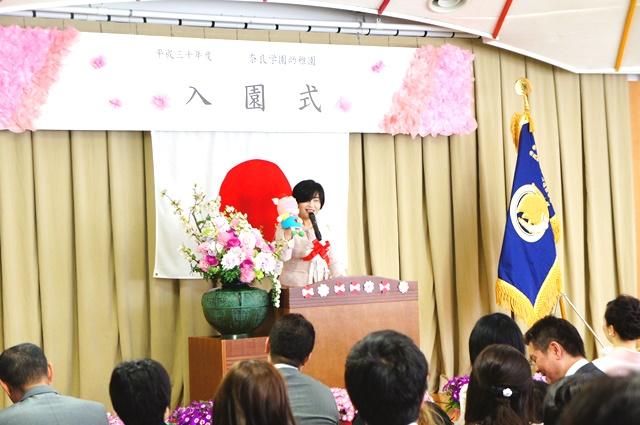 続いて谷川園長は式辞で「先生たちも、たくさんのおもちゃも、みんなが来るのを待っていましたよ。みんなには3つだけ守ってほしいことがあります。1つ目は、誰かに会ったら必ず”おはよう”とか”こんにちは”とかあいさつをしましょう。それから2つ目は、さっき名前を呼ばれた時みたいに、大きな声で”はい!”とお返事をしましょう。そして3つ目は、何かしてもらったら必ず”ありがとう”を言いましょう」と話しました。また保護者の皆様には「誠心誠意、心をこめて子どもたち一人ひとりに寄り添って、しっかり見守っていきます。ご家庭からもぜひ、あたたかいパワーを子どもたちに送ってあげてください」と述べました。