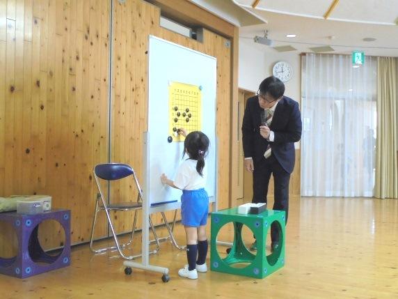 はじめに囲碁の基本について、囲碁は背筋を伸ばし対局前と対局後にきちんと挨拶をするなどマナーや黒と白の石の名前は「碁石」、碁石の置き方など一から道具の名前やルールを説明していただきました。