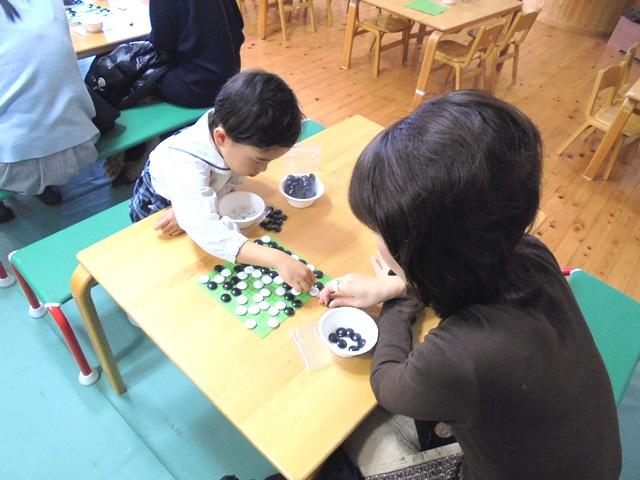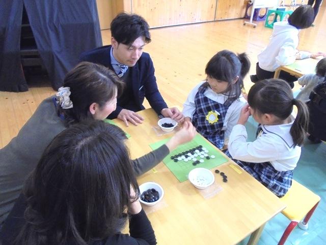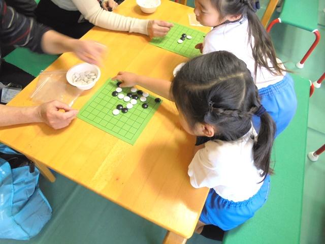 基本のルールを学んだ後は、保護者の方たちとの対戦です。小さな手と大きな手が交互に碁石を並べ、元気な声が飛び交いました。