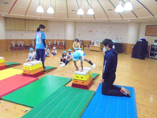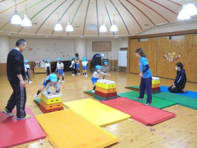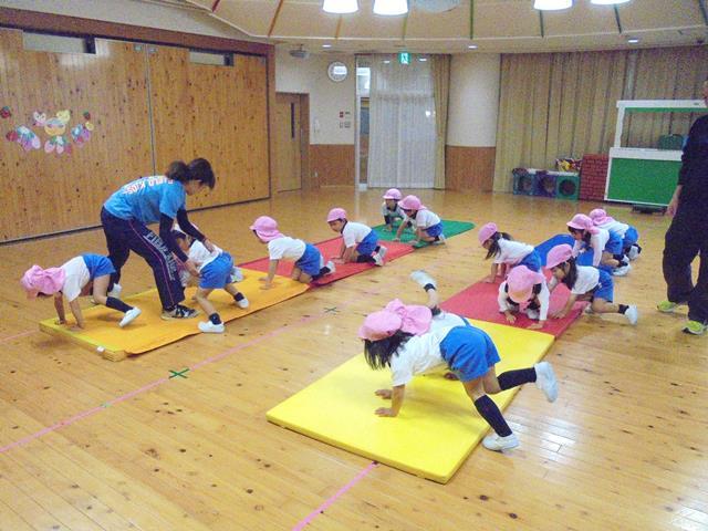 続いて、年少さんのマット運動。左右にジャンプするなどしてマットになじんだ後、前回りの練習です。勢いをつけて、思い切り、体を回転させました。怖がることなく、元気いっぱい取り組みました。