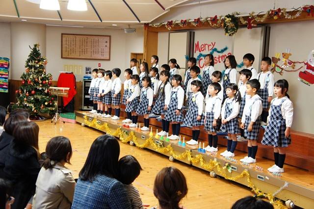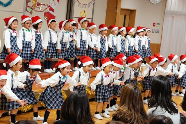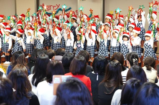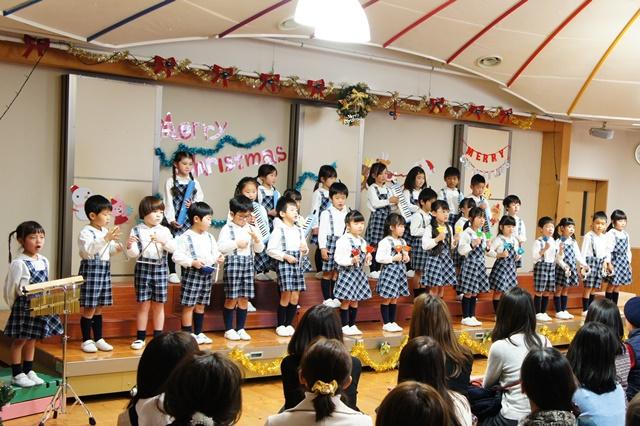 まず年少さんは、グーチョキパーの歌を振り付けをつけて英語で歌いました。年中さんは、みんなで協力して作ったお星を手に合唱しました。年長さんは、合唱と、楽器合奏を披露しました。