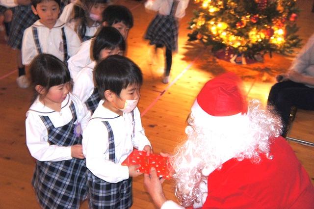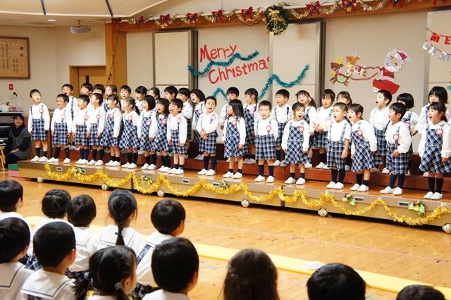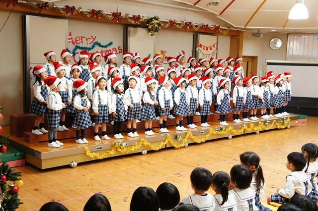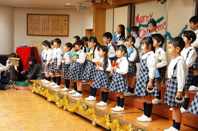 サンタさんに「こっちですよ!」と声が届くように、年少さんが歌とダンスで「サンタッタ」、年中さんは「ヤッター!サンタがやってくる」を合唱。年長さんは「天使の歌うクリスマス」を合唱し「おめでとうのクリスマス」をハンドベルやピアニカ、鈴の合奏をしました。