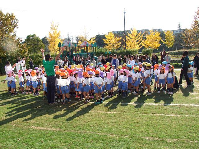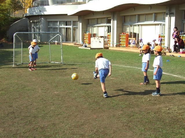 年長組から年少組まで全ての子どもたちが園庭に出て、うきうきタイムがはじまりました。太陽の下、みんなで身体を動かしました。朝の活動までは、サッカーや鉄棒で逆上がりに挑戦したり、子どもたちが秘密基地と呼んでいる真っ赤に紅葉した木の下できれいな落ち葉を探したり思い思いに楽しみました。