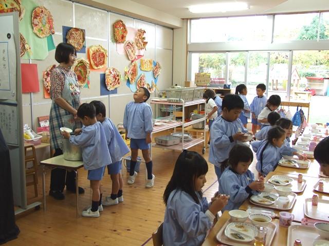 お待ちかねの給食の時間では、お当番さんがしっかり先生のお手伝いをして、配膳をします。準備が整うと手を合わせ、みんなで声をそろえて「いただきます」。楽しそうに食事をする子どもたちの顔を保護者の方もうれしそうな顔で眺めていました。