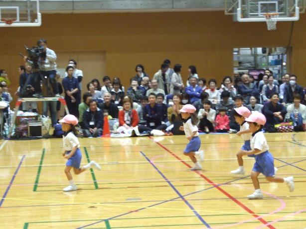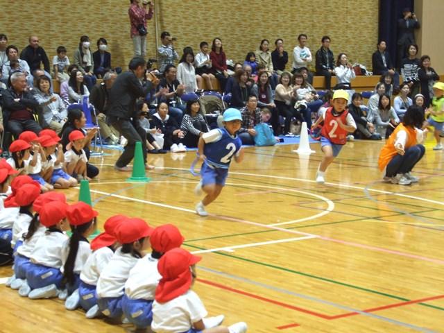 その他、「かけっこ」や年少年中合同の「玉入れ」などの競技が続き、年長組の「組体操」では、きれいなフォーメーションをいくつも決めてくれました。
