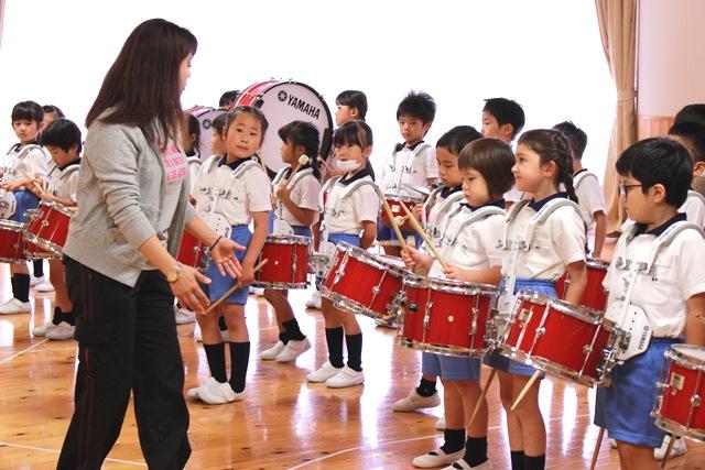 まずは遊戯室で年長組の子どもたちが、マーチング教室のご指導をいただいている幡井信子先生に立ち位置や動き、それに合わせたフォーメーションを見てもらいました。先生からは「演奏しない時はビシッと立つ!みんなのかっこいい姿を、お家の人に見せてね」