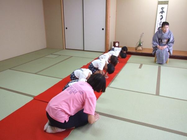 2学期最初となるお稽古は、出入りの作法の復習です。和室の入口で手をついて一礼し、入室の仕方をおさらいしました。全員が入室すると、まずは赤木先生に「よろしくお願いします」と「真」のお辞儀をしました。