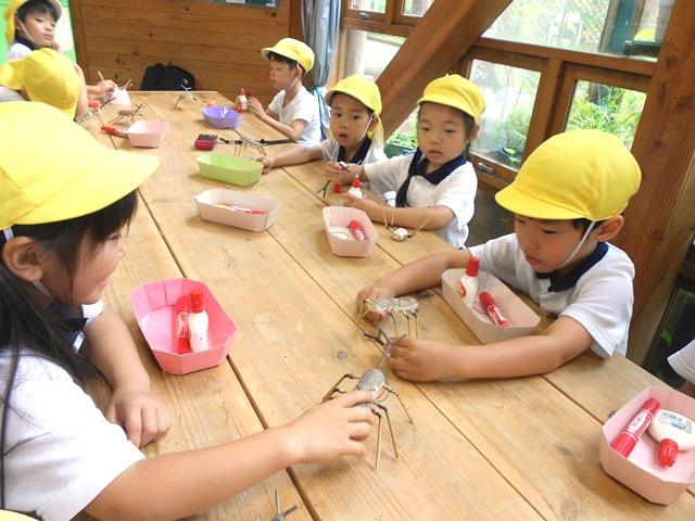 朝からあいにくの雨となり、午前中は森の工作館で自然の木を使って工作をしました。