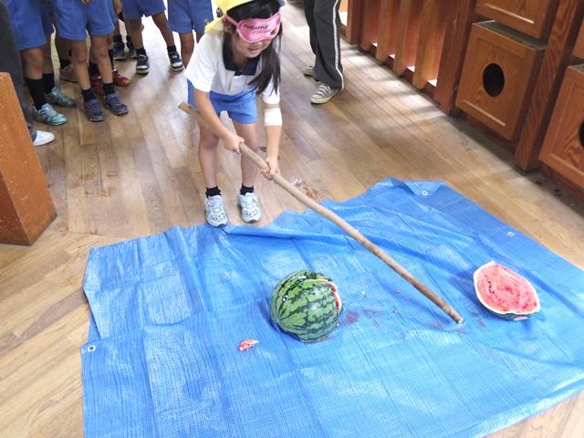 しっかり歩いた後は、楽しみにしていたスイカ割り。「みぎ~!」「ひだり~!」というみんなの声に合わせてフルスイング!みんなでスイカをおいしくいただきました。