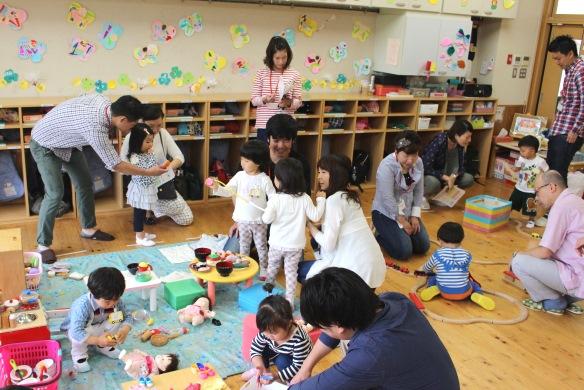 「みんなでお片付けをしましょう」の先生の合図で子どもたちは、箱におもちゃを入れたり、大きなブロックを運ぶ様子に、保護者の皆さんから「お友だちと一緒だったら、こんなにちゃんと片付けるんだ」と驚きの声が聞かれました。