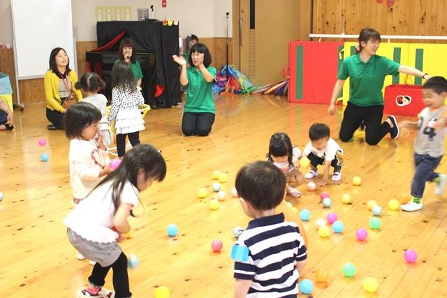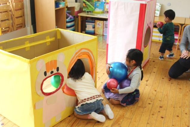 次に、フロアいっぱいに転がるカラフルなボールを「よーいどん!」で拾い集めてカゴに入れ、続いて先生が引っ張って動く箱の中にボールを投げ入れたりする遊びを楽しみました。