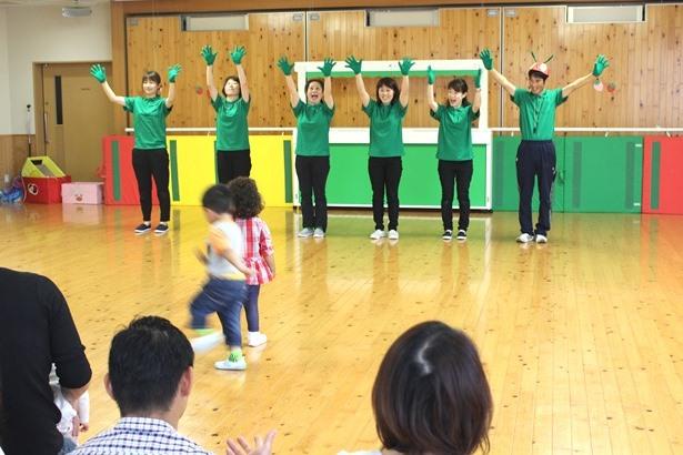 運動あそびを終え、席に戻った後は、緑のTシャツを着た先生たちによる「はらぺこあおむし」のアトラクションが始まりました。「あっ!知ってる。はらぺこあおむし」と言う子どももいて、みんな大喜びです。最後に大きな紙で作ったきれいな蝶々になるのを見て、子どもたちから拍手が起こりました。
